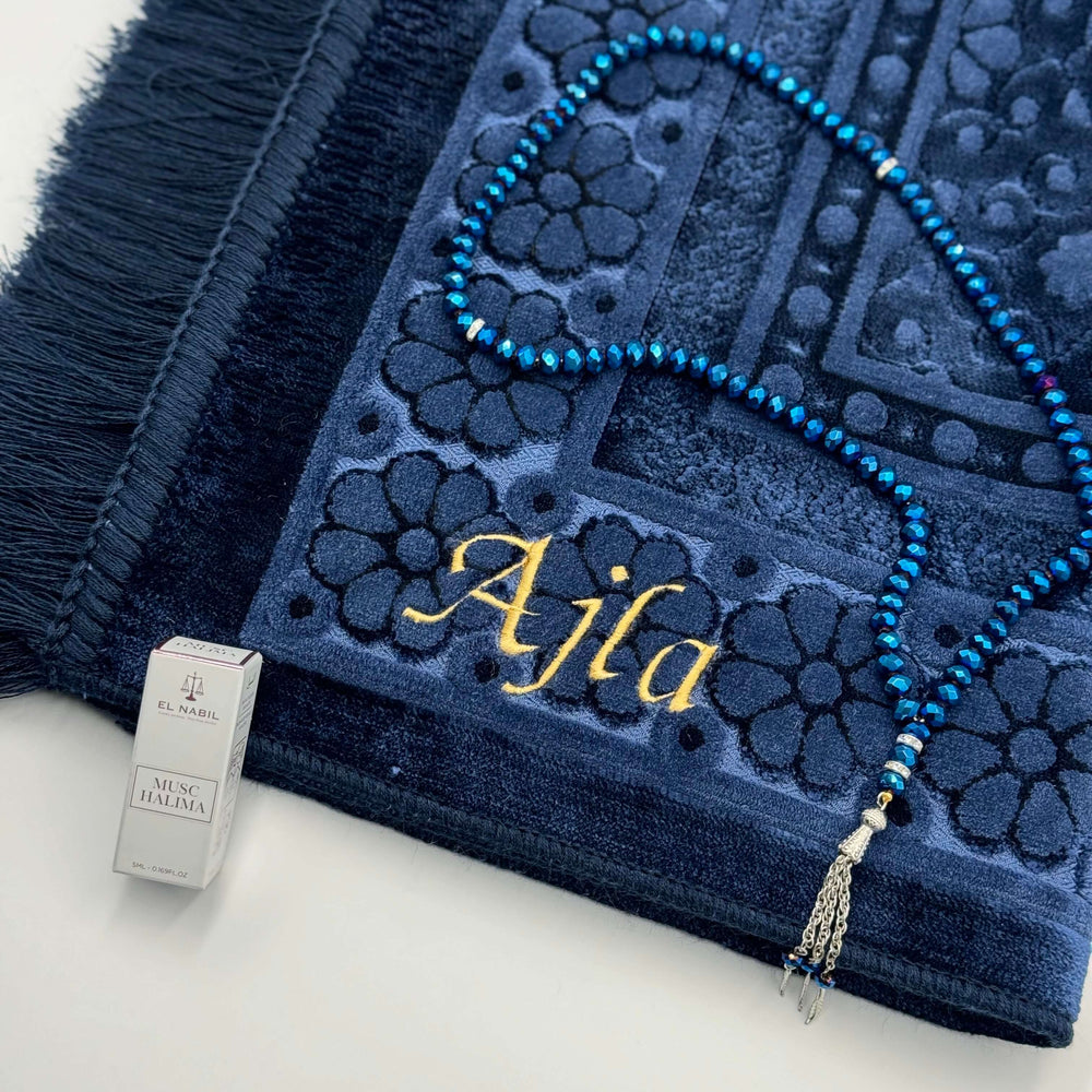 You will receive a Premium Qamarr Prayer Mat with your personalized, embroidered name. A matching tasbih (prayer beads) is always included, and everything is beautifully packed in a premium QAMARR gift box. You can also choose to add a Musk Perfume as an optional extra to your order.