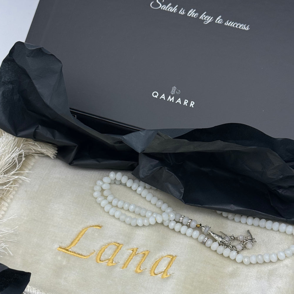 You will receive a Premium Qamarr Prayer Mat with your personalized, embroidered name. A matching tasbih (prayer beads) is always included, and everything is beautifully packed in a premium QAMARR gift box. You can also choose to add a Musk Perfume as an optional extra to your order.
