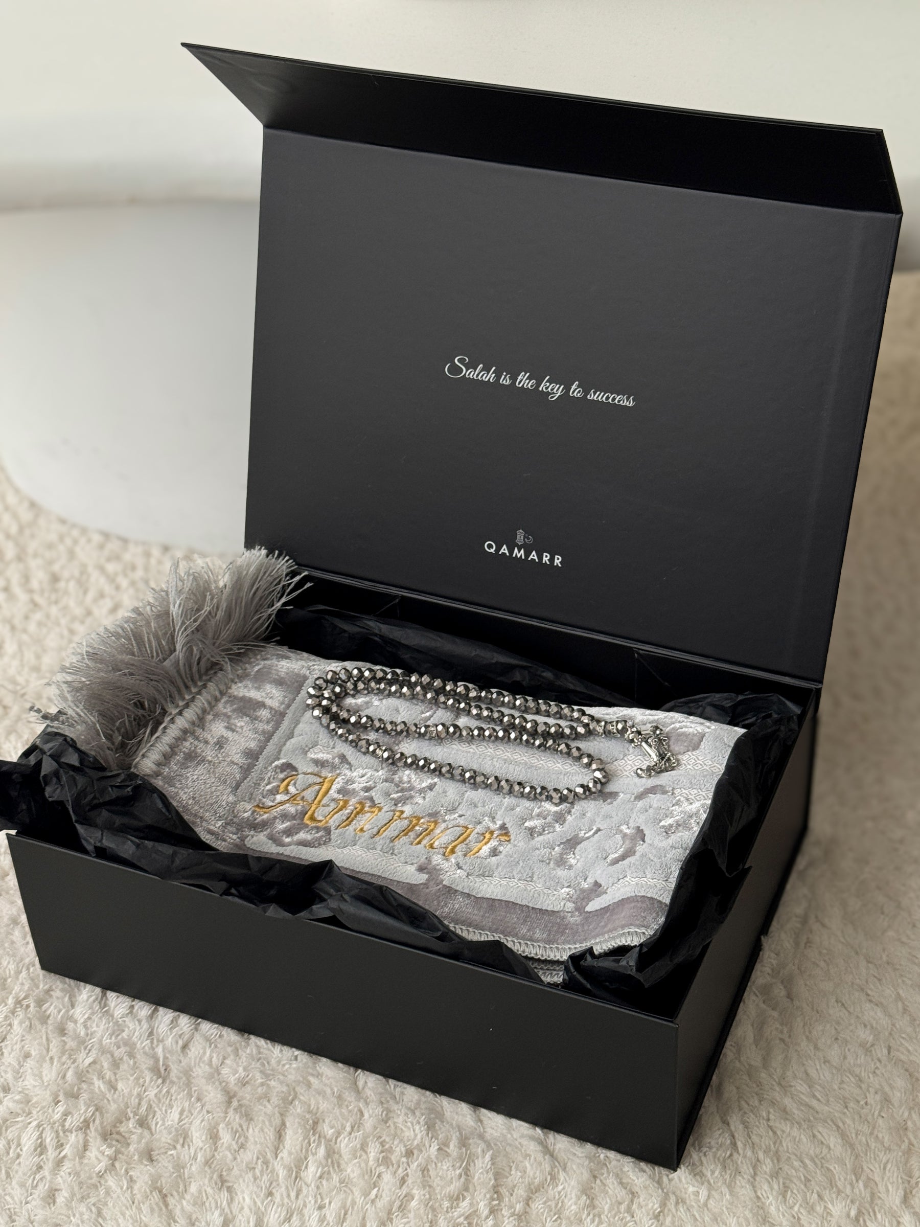 QAMARR ® Majestic Personalized Prayer mat Giftbox - Light Grey
