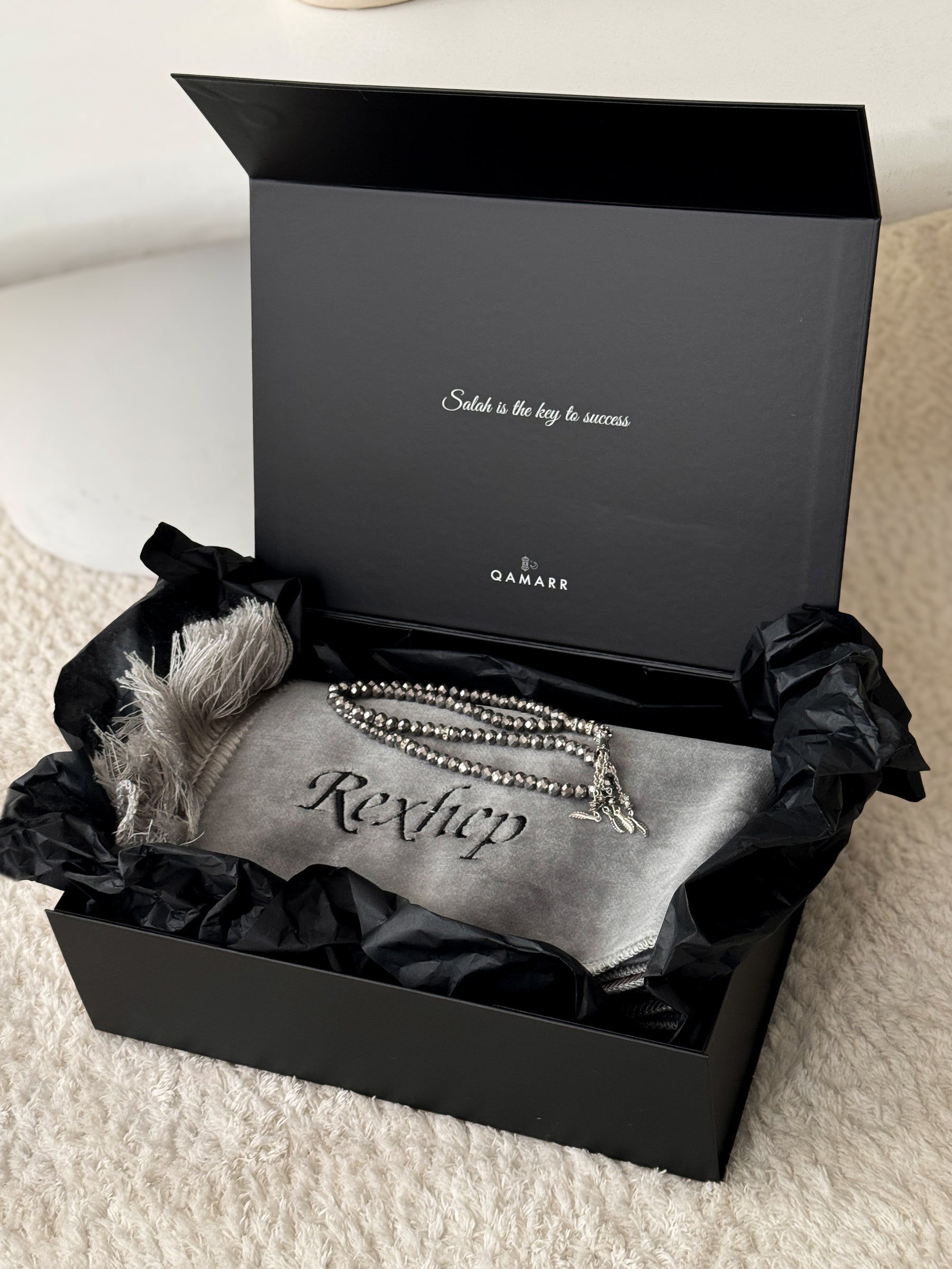 You will receive a Premium Qamarr Prayer Mat with your personalized, embroidered name. A matching tasbih (prayer beads) is always included, and everything is beautifully packed in a premium QAMARR gift box. You can also choose to add a Musk Perfume as an optional extra to your order.